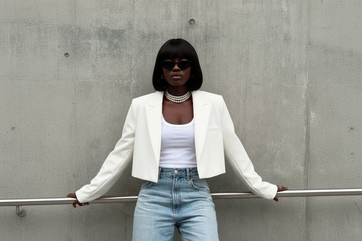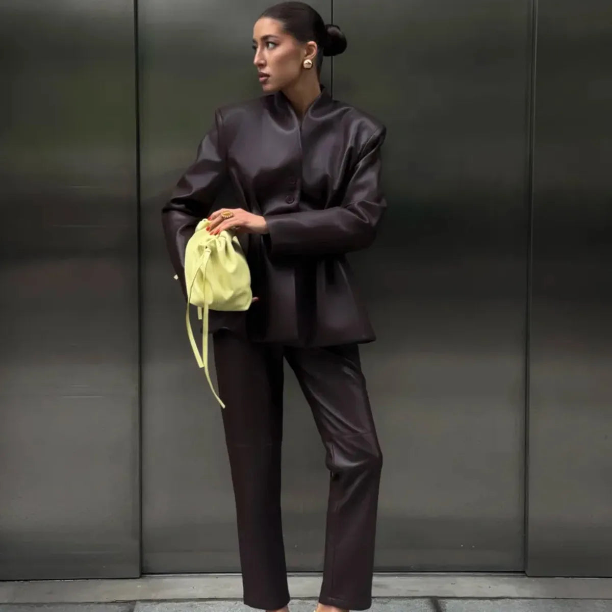 Chic Dark Brown Leather Stand Collar Belted Blazer